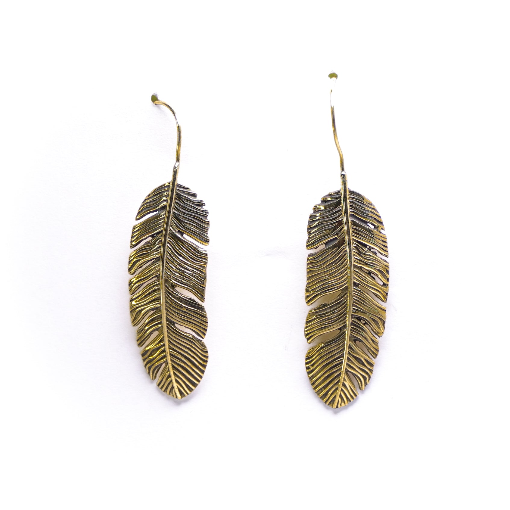 Brass drop earrings with a long feather design. No stone. Stud/hook fitting.