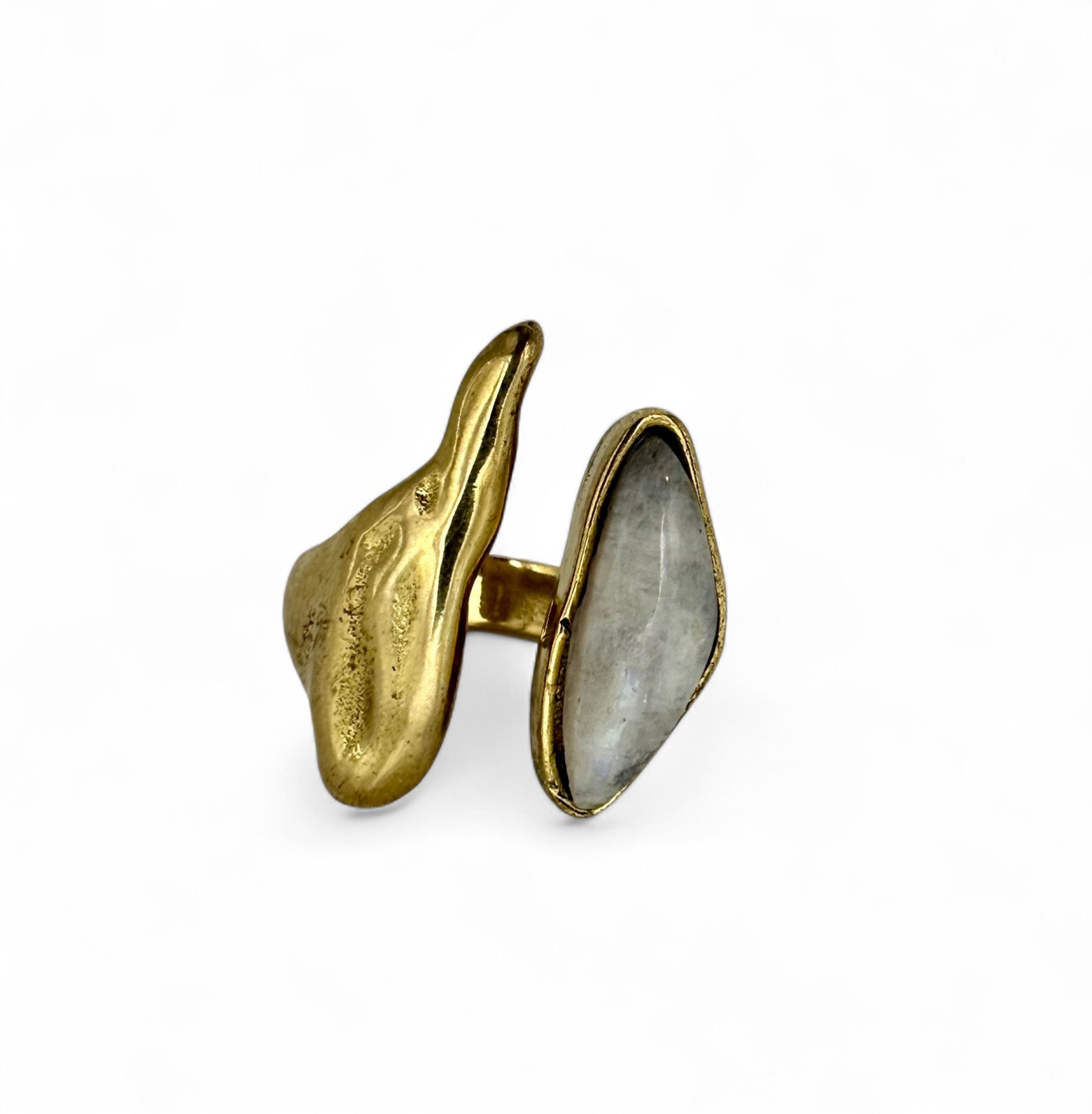 This adjustable ring is handcrafted with a moonstone crystal and high quality brass. oonstone is considered to be a powerful stone for self-discovery and intuition. A statement ring for everyday use.