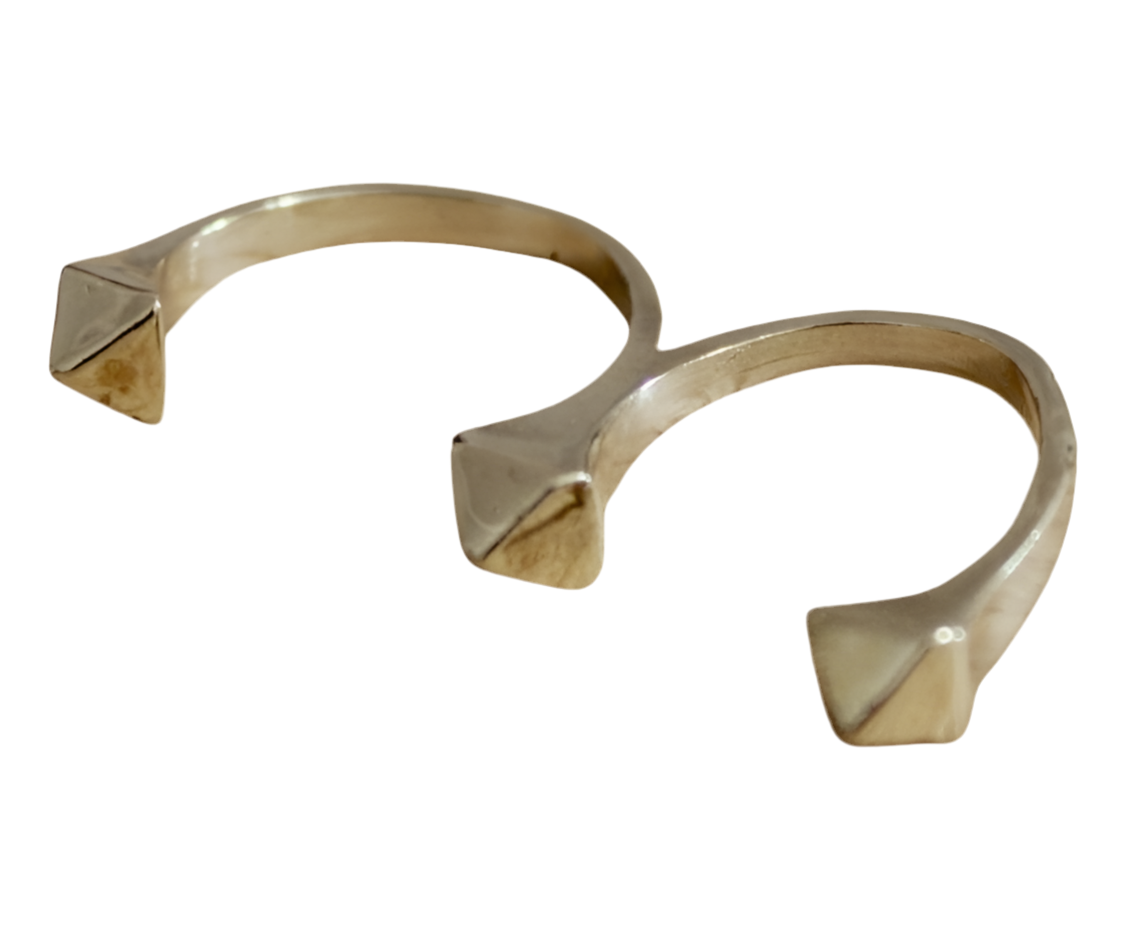 A minimalist ring that is worn across two fingers in pure brass! Adjustable to any size.